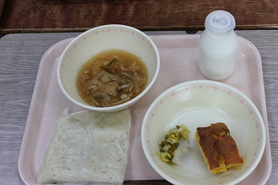 五目うどん 牛乳 春野菜のおひたし キャロットケーキ