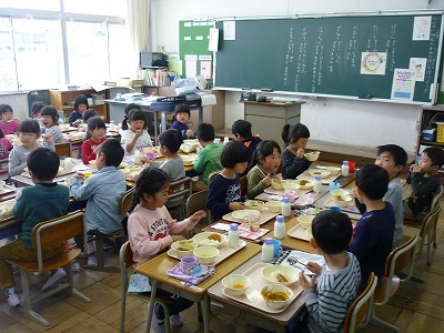 初めての小学校でのを給食みんなで、楽しく食べていました。