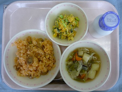 チキンライス 牛乳 パンプキンサラダ コンソメスープ