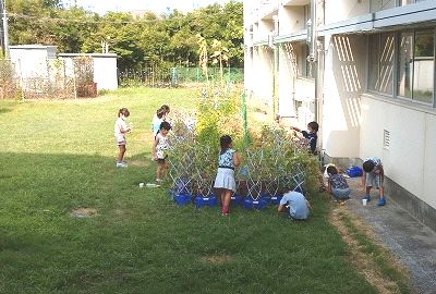 1年生のみなさんは、毎朝、アサガオに水をあげ、種の取ります。