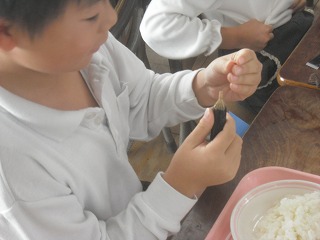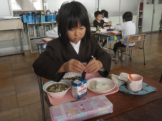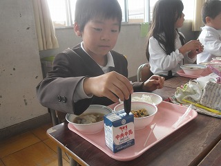 子どもたちは、昨日の給食で紹介した「液体コーヒー牛乳の素」を、紙パックに入れるのは初めてでしたので、先生の話を聞いておそるおそるやっていました。