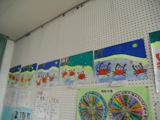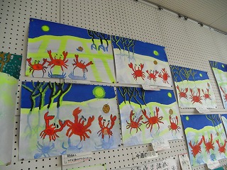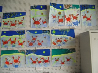 5年生が作った宮沢賢治の「やまなし」の読書感想画が完成し、掲示してあります。