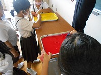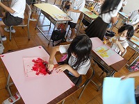1年生が図工で、スタンピングに挑戦していました。先日紹介したスパッタリング同様、絵を描く時の技法のひとつです。「型押し」とも言って、いろいろな型や自分で作ったものに色を付けてスタンプ(判子)を押すように、何度も紙に同じ型を押して、絵を描いていきます。