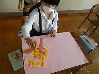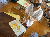 この日は、赤や黄色の絵の具を使って、秋に紅葉(黄葉)した木を描いていました。