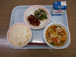 ご飯 牛乳 マグロと大豆のマリアナソース和え ホウレンソウのおひたし 鳴門汁