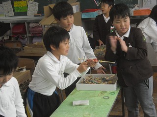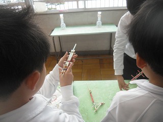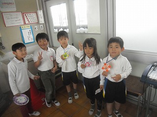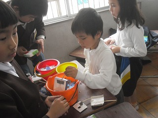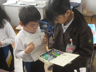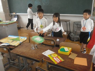2年生が生活科で作っていたおもちゃを使って「おもちゃランド」を作り、1年生を招待してお楽しみ会を行いました。自分たちで作ったおもちゃを並べてブースを作り、1年生のお客さんにルールを説明して楽しんでもらいました。