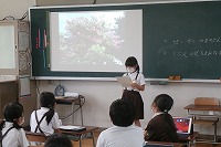 2年生が生活科でまとめた「まちたんけん」の発表をしていました。撮った写真をプロジェクターで映しながら、みんなの前で発表します。指示棒の使い方などまだまだなれないことが多いですが、照れながらもがんばって発表していました。