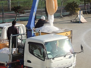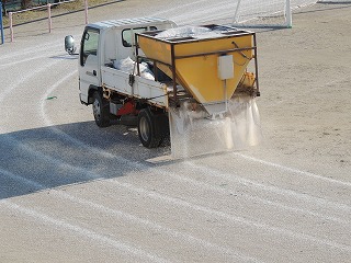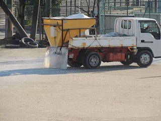 昨年もこの時期に撒いたことを紹介しています。運動場全体にまんべんなく撒くためには、大きなトラック1台分の塩化カルシウムが必要です。運ぶためのトラックと、撒くためのトラック2台が協力して行いました。