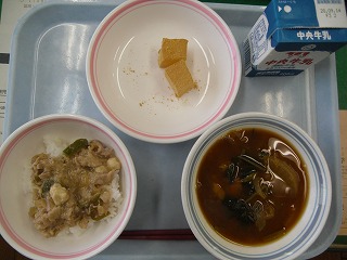 ご飯 牛乳 肉豆腐丼 かぼちゃの味噌汁 わらび餅