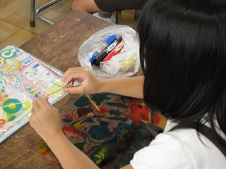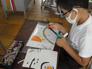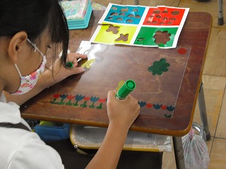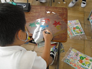 2年生が図工で「光のプレゼント」を作っていました。透明なシートにセロハンのように透ける色のシートを好きな形に切ってはったり、いろいろな色のペンで絵をかいたりして、光で透ける絵を作ります。
