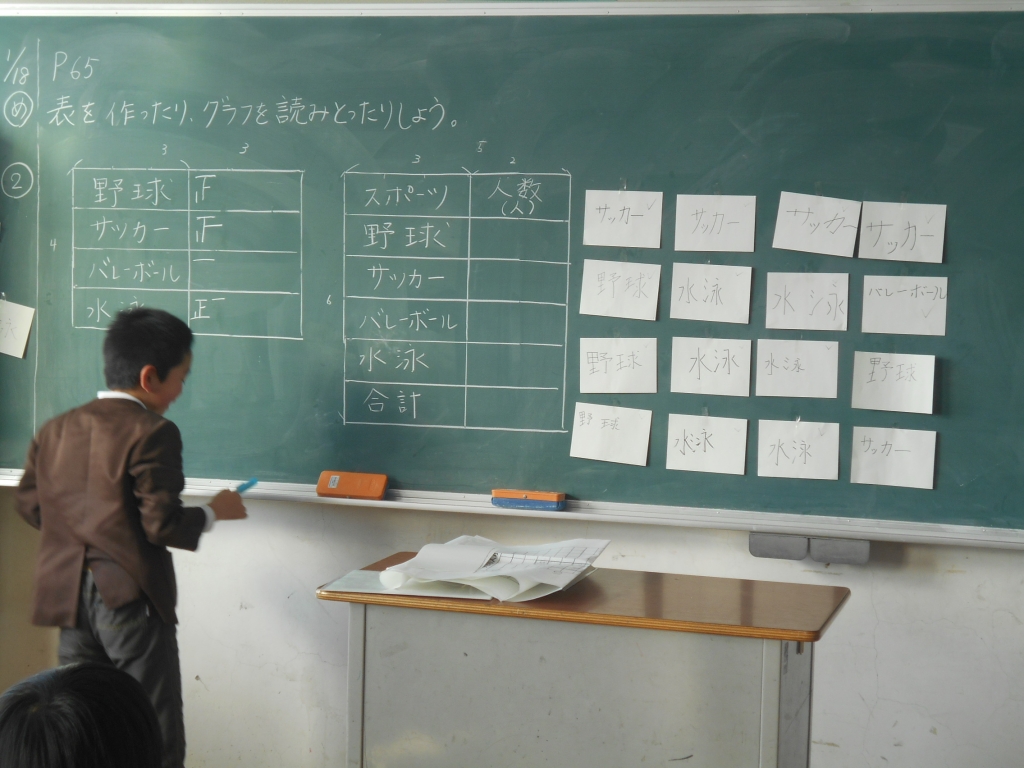 3年生は、算数で「表とグラフ」の学習をしています。好きなスポーツや動物の人数を表にまとめました。理科では、どんな物が電気を通すか実験しました。