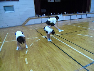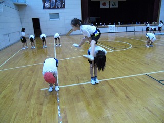 3年生が体育で馬跳びをしていました。一つずつ跳んでいる子、連続で跳ぼうとしている子、馬を低くして跳ぼうとしている子など様々でした。