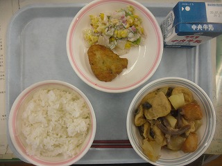 ご飯 牛乳 関東煮 鯵(あじ)の唐揚げピリ辛だれ 梅マヨサラダ