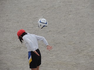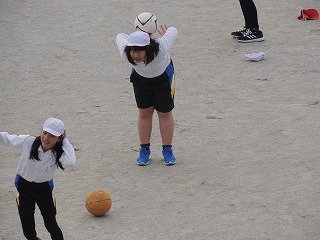 まずは、ボールを前から投げ上げて、後ろ手でキャッチする。ボールを投げ上げる高さと角度をコントロールし、何よりもボールの大きさを意識しないとうまく取れません。中にはボールが落ちてくるのを待ちきれず、体が斜めになってしまう子もいました。