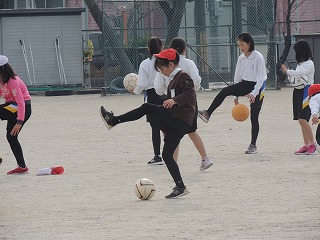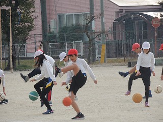 5年生の体育で、ボールを使って、いろいろな体のつかいかたの練習をしていました。