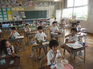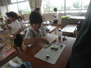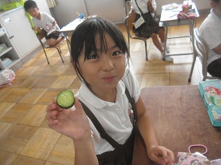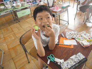 2年生が収穫できたキュウリをみんなで食べていました。収穫したてのみずみずしいキュウリを洗って輪切りにし、塩を振っただけなのですが、そのおいしさはみんなの笑顔から想像できますね。