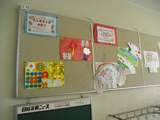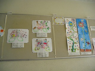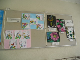 児童玄関(昇降口)には、各学年の図工などで作成した絵などの作品が掲示してあります。現在、コロナ関係で、保護者のみなさんが学校に来られる機会はあまりありませんので、少しずつ紹介していきたいと思います。