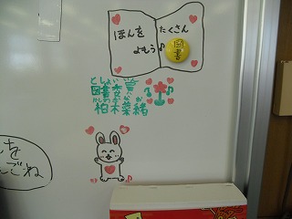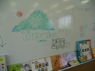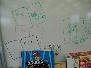 図書室のホワイトボードには、図書委員会の子たちが描いた、みんなに本を読むことを呼び掛ける絵が描いてあります。