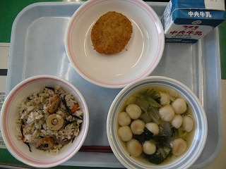 ご飯 牛乳 ひじきの混ぜご飯 枝豆コロッケ 茗荷(みょうが)のすまし汁