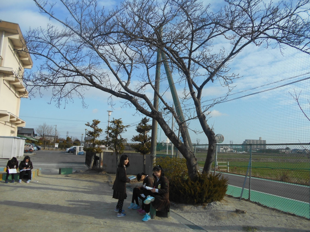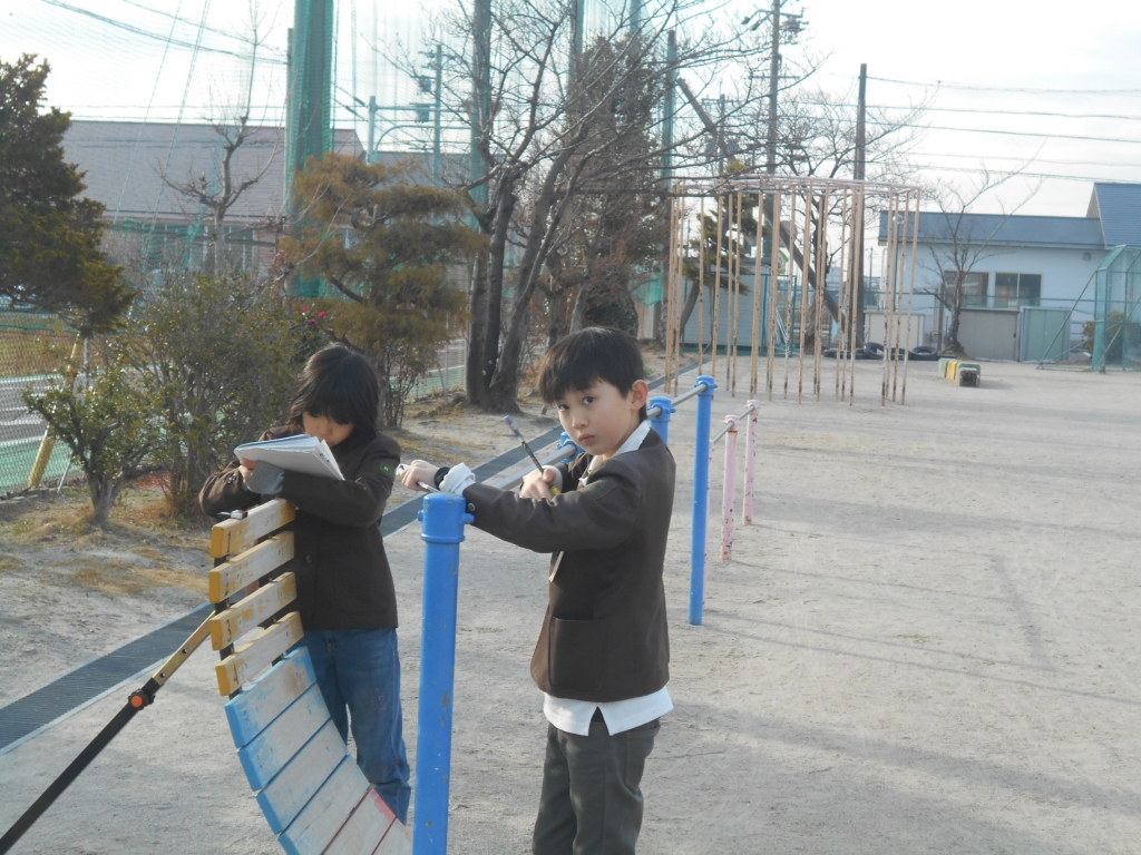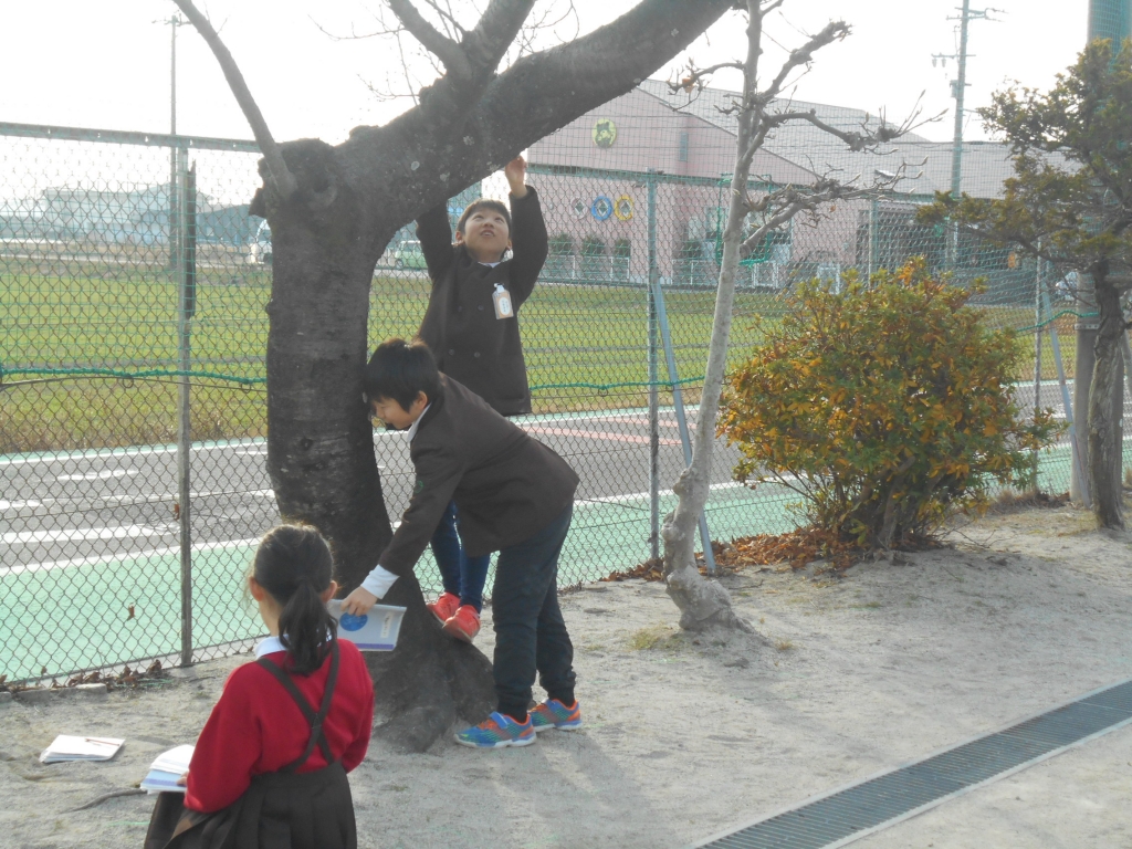 4年生は、理科で寒くなると植物や動物の様子がどうなるか考えます。校庭に出て観察しました。