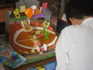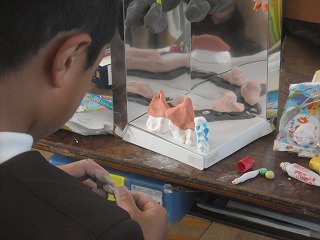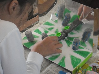 5年生のミラクルミラーも着々と完成に近づいています。大きく2分の1の180度で1面の鏡として使うか、4分の1の90度の鏡として使うかはそれぞれの考えです。鏡に映る部分をどう使うかも工夫の一つです。実際に貼り付ける前に、鏡の前に並べてみて、移り方を考えながら億位置を決めていきます。