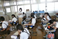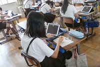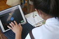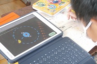 6年生が理科で、月の満ち欠けについて学習をしていました。月は約28日で新月から半月そして満月へと大きくなり、そこからまた小さく欠けていきます。なぜそう見えるのか、タブレットのアプリを使って月の見え方について確認していました。