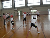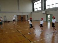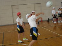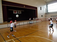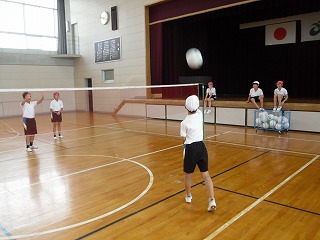 5年生が体育でソフトバレーボールに取り組んでいます。パスの練習をした後、バドミントン用のネットを張って、3,4人ずつで試合形式の練習を行いました。