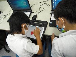 2年生がコンピュータ室でタブレットの練習をしていました。言葉で何度も説明するよりも、実際に触って動かしてみた方が使えるようになりやすいものです。