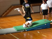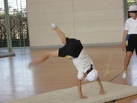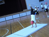 前転、後転、開脚前転、開脚後転、側方倒立回転、ロンダート(側方倒立回転跳び1/4ひねり後向き)など、できる種目や、挑戦したい種目などみんなで取り組んでいました。