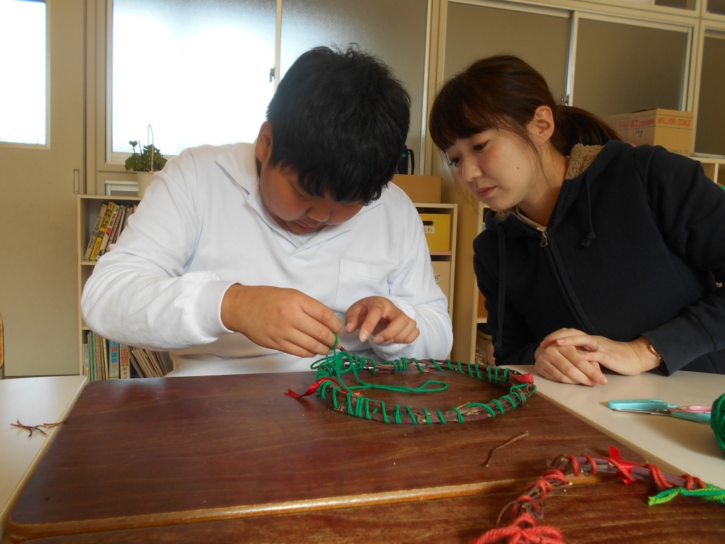 ひまわり学級では、リースづくりをしています。ちょうちょ結びも練習中です。