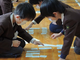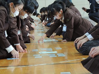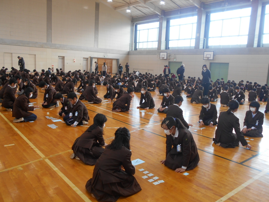 全校で、日本の伝統文化である百人一首をする集会をしました。インフルエンザ予防のため、マスクを着用して行いました。低・中・高学年に分かれて、事前にくじでひいた対戦グループで3回戦行いました。