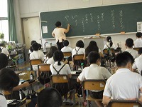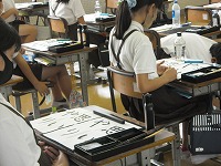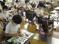 5年生が書写で「赤い羽根」や「思いやり」の字を書いていました。とめやはね、はらいを意識して、何度も練習してから清書に取り組みました。