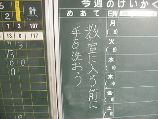 今週の目標は、「教室に入る前に手を洗おう」です。学校が再開してからもうすぐ1か月ですが、みんな気持ちが緩んできていませんか? コロナウイルスでもインフルエンザウイルスでも、手洗いが最も有効です。登校した後や、外から戻った時、他のものを触った後など、意識してこまめに手を洗いましょう。