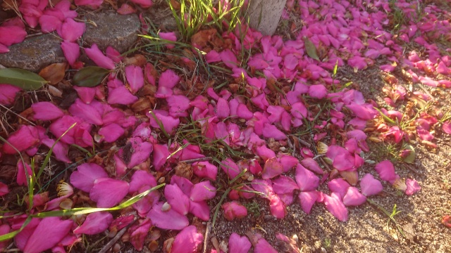 以前紹介したように、似ている花でも山茶花は花びらが1枚ずつばらばらに散るのに対し、椿は一つの花が丸ごと落ちます。こんな花びらの絨毯は山茶花にしかできませんね。