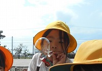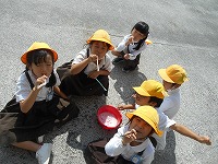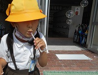 1年生がストローでシャボン玉を飛ばそうとがんばっていました。大きなシャボン玉ができるように、ストローの先ををはさみで加工しています。ただ、シャボン玉を大きくするためには、ゆっくりと長く息を吹かなければいけませんが、それには技術が必要です。また、風が強くふいていたので、すぐに風に飛ばされてなかなか大きくなりませんでした。