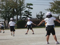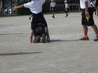 1年生が体育で「こおりおに」を行っていました。鬼に触られたら「大の字」に凍ってしまい、助けてもらうためには、味方に足の間をくぐってもらわなければなりません。
