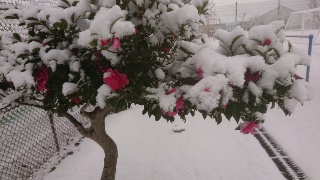 昨日の雪で、花が咲いている山茶花も雪をかぶった姿になりました。