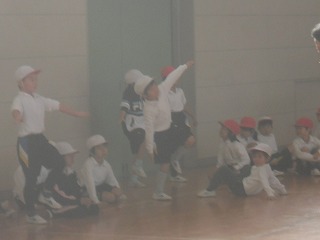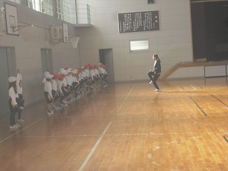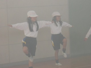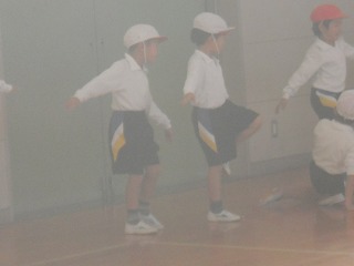 1年生が体育で「バランスゲーム」をやっていました。みんな片足立ちになり、両足でついたり片足でけんけんと跳んでしまったりした人から座り、だれが一番長く片足でいられるかの競争です。