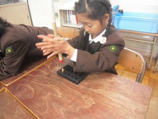2年生は、ビオトープで見つけたドングリを使ってドングリ独楽(こま)を作り、遊びました。取ってきたドングリを固定する台に乗せて、錐(きり)で穴を開けます。そして、爪楊枝(つまようじ)をさしこんで回してみました。