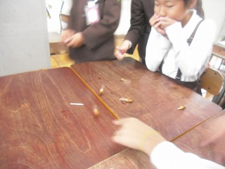 うまく回るものもあればなかなか回らないものもあって、みんなもっと作りたがりました。家でも、ドングリ独楽を作って楽しんでみてください。(もしも、家の近くにドングリのなる木がなければ、学校に落ちているドングリを拾っていってもOKですよ。