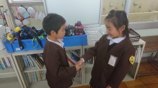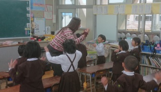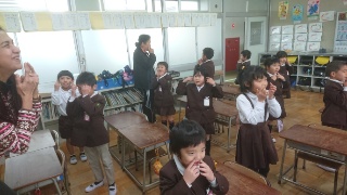 1年生の外国語はスムーズに始まります。はじまりのあいさつの””Let's start English!”から、"How are you?"など、字は書けなくてももう、どんな風に挨拶するかみんな覚えているからです。マイラ先生も驚いていました。