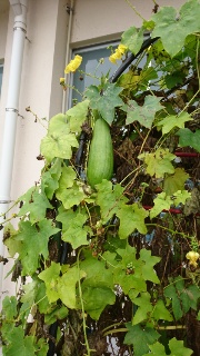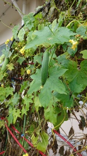 昨日紹介したヘチマですが、あらためてよく見ると、ずっとなかったヘチマの実が付いていました。例年ならもっと暑い時期からでき始め、今頃は種を取るために放っておくところなのですが、このヘチマの種類のせいなのか、気候的なものなのか、今頃実がなり始めました。