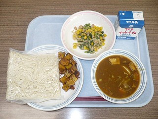 和風カレー麺 牛乳 春菊とツナの和え物 さつまいもと大豆の黒蜜がらめ