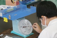 3年生が算数の重さの学習で、ばねばかりを使って、身のまわりの物の重さを測っていました。2kgまで計れるばねばかりなので、軽い物では鉛筆から、重いものはタブレットや水筒など、様々なものをのせていました。