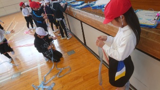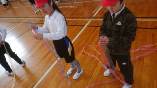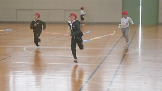 1年生体育の忍者走り(タフロープ・ラン)で、シッポを長くしていくとしていましたが、子どもたちは順調に走り、シッポがどんどん長くなっています。