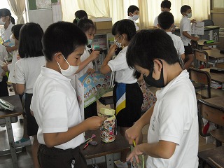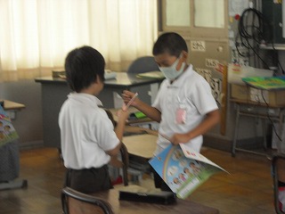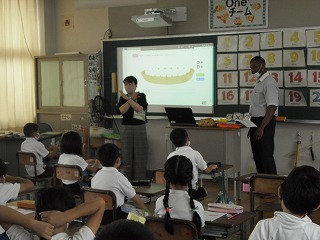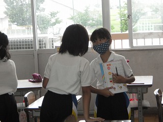 3年生は英語で、「How many apples?」という質問をお互いにして、自分の色を塗ったリンゴの数を答えあっていました。