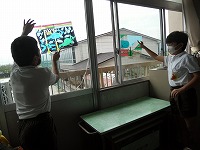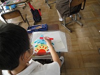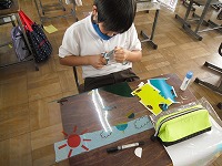4年生が図工で、透明なアクリルに色つきのセロハンなどで絵を描く、「光のさしこむ絵」に取り組んでいます。思い思いに材料を切り取ったり色つきのペンを使ったりしてカラフルな絵を描いていました