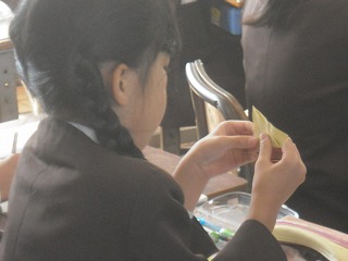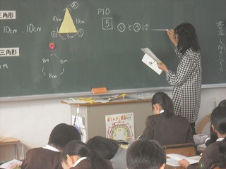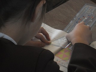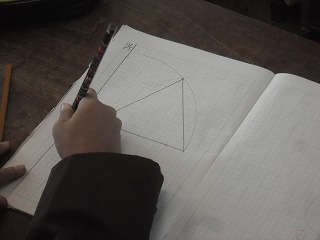 3年生は算数で、正三角形や二等辺三角形を書く学習をしていました。コンパスや三角定規を使って辺の長さや角の大きさを正確に書きます。書いた図形を切り取って、角の大きさを重ねて確認しました。