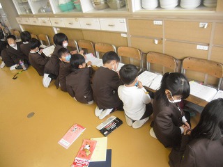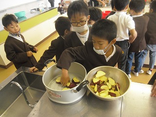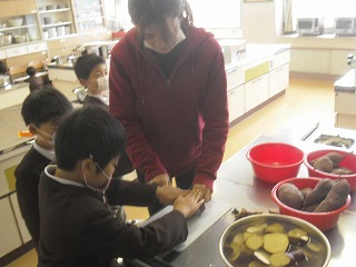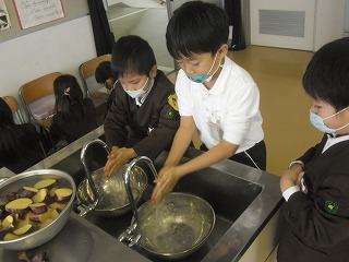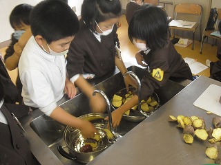 いもパーティーのとりを飾るのは1年生です。もちろん一番シンプルにふかしイモにするのですが、包丁や火を使うことは楽しい面ばかりでなく危険な面もあることを意識しなければなりません。全員一斉の作業ではなく、グループ数名ずつ呼んで作業し、待っている子たちは学習や読書に取り組んでいました。