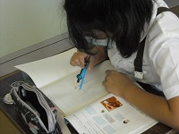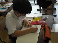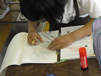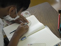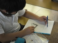 5年生が算数で合同な三角形をいろいろな方法で書いていました。コンパスを使う人、分度器を使う人、三角定規を使う人など合同に必要な条件をうまく使っていました。